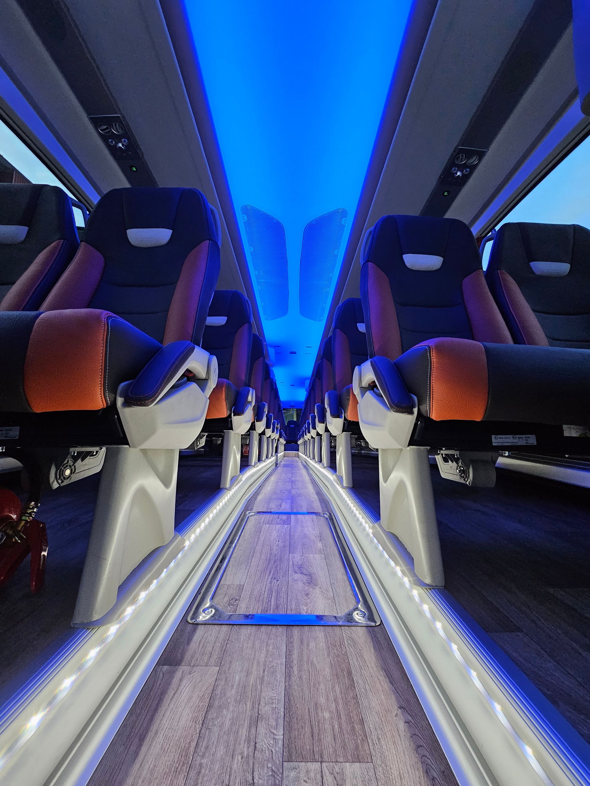 Todos nuestros vehículos están equipados con asientos reclinables, monitores de televisión, aire acondicionado; todo especialmente diseñado para viajes largos con la mayor comodidad.